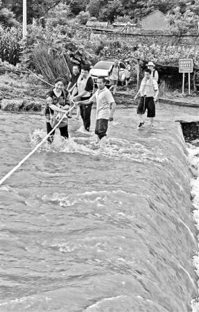 洪水沖毀了龍泉峪村連接外界的唯一橋梁,第一書記肖學(xué)成和村干部找來(lái)繩索,固定河道中的一棵大樹(shù)后進(jìn)村救人。村民們背著包,志愿者們背著老人,一趟一趟轉(zhuǎn)移。