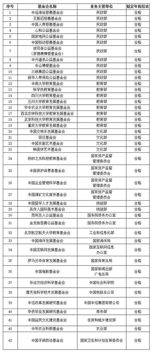 7月4日,民政部社會組織管理局對基金會2016年度檢查擬定結(jié)論予以公示,第一批43家基金會擬定年檢結(jié)論全部為合格。