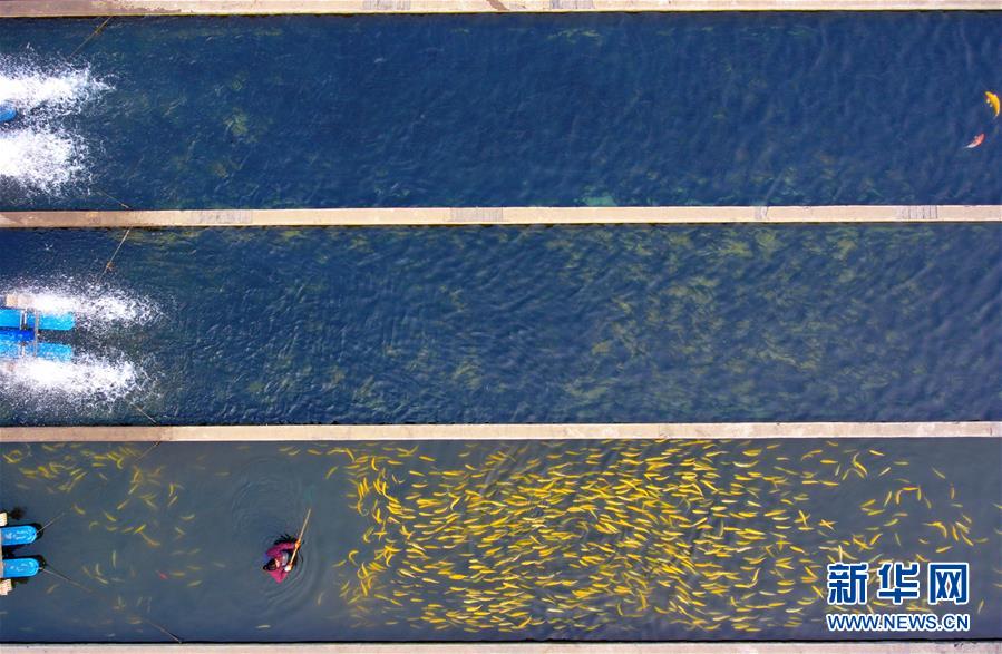 山西省平定縣娘子關鎮(zhèn)坡底村村民李海芳在養(yǎng)殖合作社內撈魚(2月27日無人機拍攝)。
