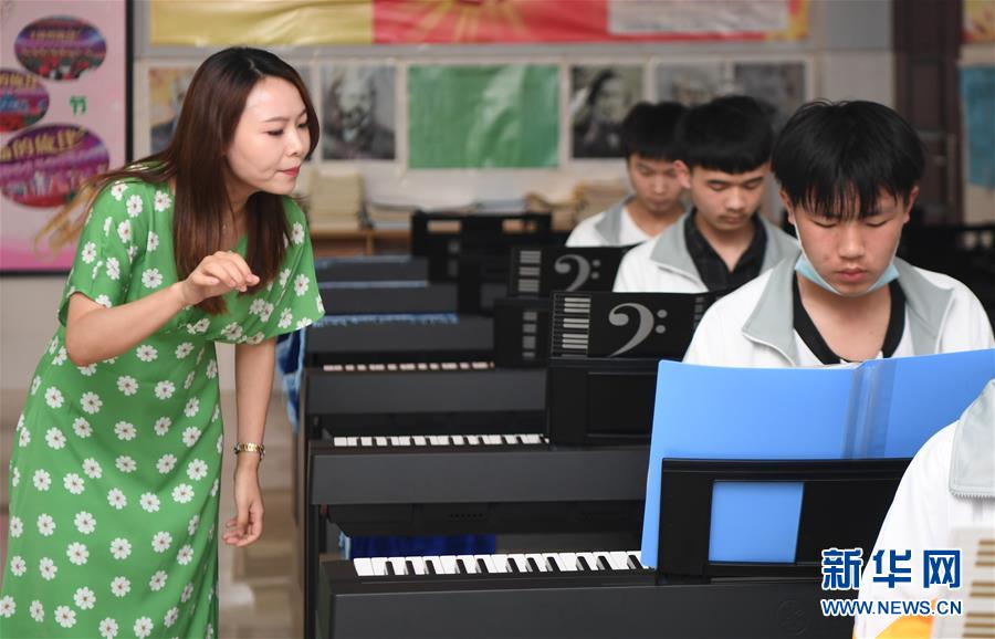 5月22日,瀘溪縣第五中學(xué)的老師(左)在給學(xué)生上鋼琴課。 瀘溪縣第五中學(xué)位于湖南省湘西土家族苗族自治州瀘溪縣武溪鎮(zhèn),是一所農(nóng)村普通完全中學(xué)。學(xué)校自2006年起免費(fèi)開設(shè)各類藝術(shù)培訓(xùn)課,培養(yǎng)農(nóng)村學(xué)生的藝術(shù)興趣、專業(yè)特長(zhǎng)。 新華社記者 薛宇舸 攝