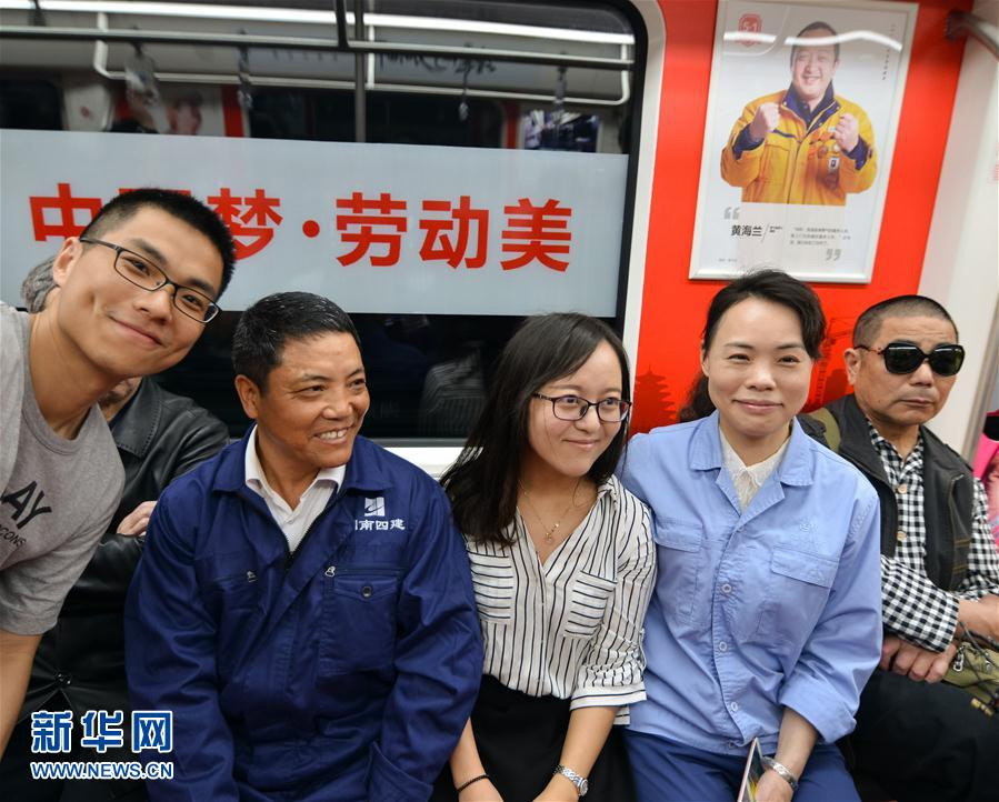 5月1日,全國(guó)勞模吳曉紅(右二)、劉志堂(左二)在“勞模地鐵專列”車廂內(nèi)與乘客合影。 “五一”勞動(dòng)節(jié)期間,一列“勞模地鐵專列”亮相長(zhǎng)沙地鐵1號(hào)線。該列車在車廂內(nèi)集中展示了由全國(guó)勞模、攝影家謝子龍拍攝的88位不同崗位全國(guó)勞模的肖像作品,旨在展示“勞動(dòng)最光榮、勞動(dòng)最崇高、勞動(dòng)最偉大、勞動(dòng)最美麗”的精神。新華社發(fā)(陳思維 攝)