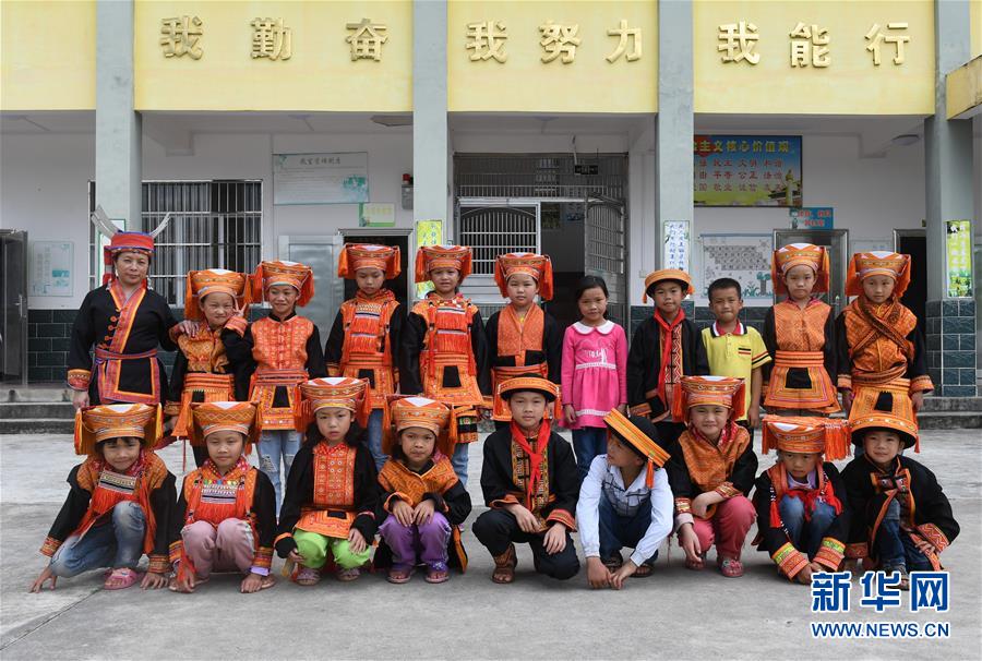 6月4日,在廣西金秀瑤族自治縣忠良鄉(xiāng)山界教學(xué)點(diǎn),陶鳳英和學(xué)生合影。