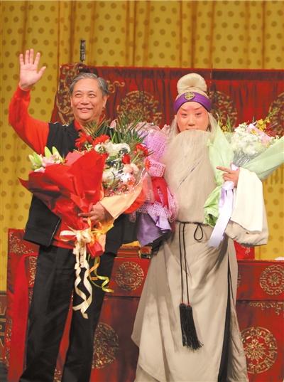 穆雨演出京劇《四進(jìn)士》后,跟師父張學(xué)津(左)一起謝幕。田超供圖