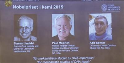 一名瑞典科學(xué)家、一名美國科學(xué)家和一名擁有美國和土耳其雙重國籍的科學(xué)家因在DNA(脫氧核糖核酸)修復(fù)方面的研究而分享2015年度諾貝爾化學(xué)獎。