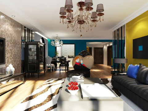 客餐廳設計: 客廳以后現(xiàn)代風格為主,黑白鏡面的設計以及黃色背景墻成為空間亮點。采用反光的壁紙和鏡面提升整個空間的現(xiàn)代感,亮色乳膠漆的運用點亮了整個空間。