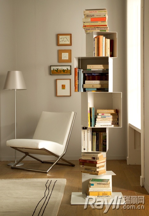 三塊形體相同的書架單元,按照不同的方向錯開擺放,就能形成一個極具裝飾性的書架。
