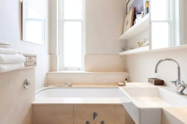 <p>利用浴缸延伸的臺(tái)面以及之下的抽屜做收納</p>