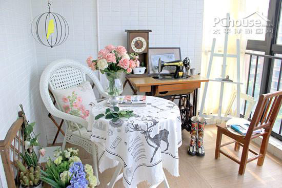 陽臺墻面鳥籠裝飾:靈氣十足的鳥籠造型配合銹色金屬裝飾,把大自然的田園野趣鋪陳開來。白色的戶外桌椅與植物的點綴,裝點出愜意的休閑陽臺空間。