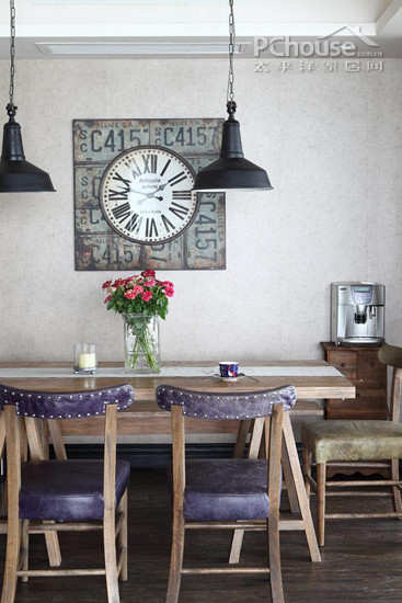 復古掛鐘:餐廳區(qū)融合了多種歐洲復古元素的裝飾,墻面的裝飾是一個做舊質(zhì)感的掛鐘,銹跡與復古的色彩延伸了整個空間,搭配復古的餐椅與黑色吊燈,在方寸之地一股濃郁的美式鄉(xiāng)村復古氣息撲面而來。