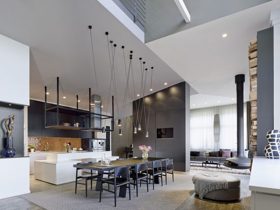裝飾Tips:長(zhǎng)長(zhǎng)的吊燈給餐廳帶來很多優(yōu)雅的感覺,白色的開放式廚房干凈清爽,深淺搭配讓人眼前一亮。