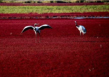 4、5月份長出地面的群生翅堿蓬,到了9、10月間便慢慢地由綠變紅、變紫,如巨大的猩紅色地毯般鋪......