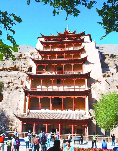 莫高窟又名“千佛洞”,位于敦煌市東南25公里處鳴沙山的崖壁上。這里全年日照充足、干燥少雨、四季分明,晝夜溫差較大。石窟南北長1600余米,上下共五層,最高處達(dá)50米,F(xiàn)存洞窟492個,壁畫45000余平方米,彩塑2415身,飛天塑像4000余身。