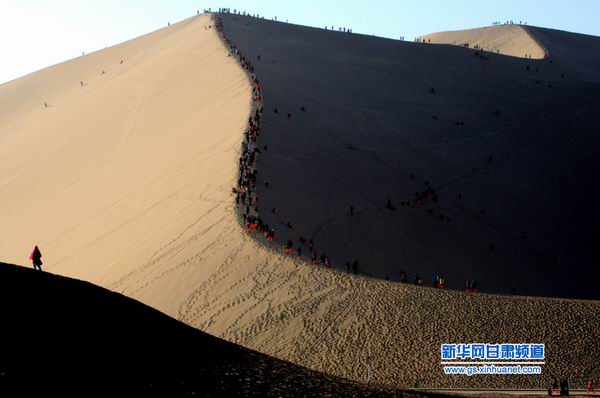 央廣網(wǎng)蘭州11月5日消息 甘肅鳴沙山月牙泉景區(qū)風(fēng)光迷人,吸引了眾多中外游客。鳴沙山月牙泉位于甘肅省敦煌市城南5公里,沙泉共處,妙造天成,以“沙漠奇觀”著稱于世。新華社發(fā)(王將 攝)