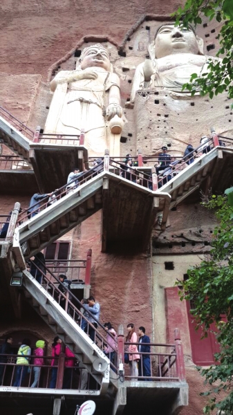 麥積山石窟棧道上游客排隊(duì)參觀
