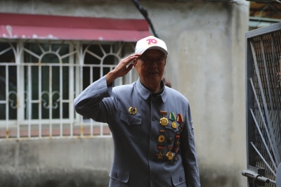 由于余老身體不是很好,原本約定只談40分鐘,但是很快一個小時就過去了。離別時,余老堅持要送我們,并且特意換上了參加閱兵式的八路軍軍服。就這樣,余老從屋子里,一直送我們到院子里。在院子里,余老與大家合影留念。之后一一握手道別。等我們走出了院門,回頭再看時,余老站的筆直,敬了一個很標準的軍禮。那一刻,記者們在感動之余,瞬間將“長槍短炮”再次聚焦這位老人。