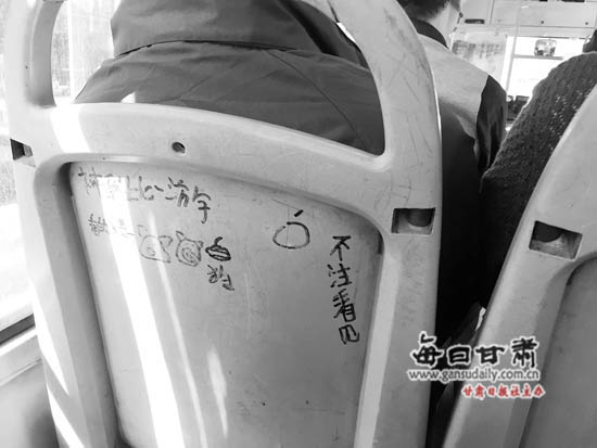 市民張先生9月14日告訴記者,他9月13日從蘭州火車站乘坐137路公交車準(zhǔn)備到中山鐵橋,上車后他看到前排的座位已經(jīng)坐滿了人后,就在后排找了個(gè)座位坐下了,剛坐穩(wěn),張先生就發(fā)現(xiàn)他前面的座位被人用筆寫下了這樣一段話:“誰坐這個(gè)座位誰就是SB。”張先生非常氣憤,認(rèn)為這樣做太沒公德心了。其實(shí),張先生反映的情況記者也發(fā)現(xiàn)過,不僅137路公交車上有“留言”,其它一些公交車座位上也有,這些“留言”可謂五花八門,完全把公交車座位當(dāng)成了“寫字板”,隨意亂寫亂畫。在此,我們也呼吁那些喜歡“留言”的乘客請(qǐng)找對(duì)下筆的位置,公交車并不喜歡你留墨。
