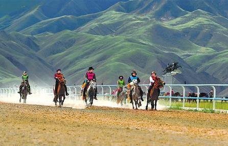 6月8日,肅南裕固族自治縣“雪域”杯第四屆賽馬會(huì)在祁連山北麓的索朗格國際賽馬場舉行。 成林 攝