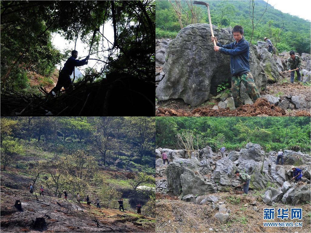 拼版照片:融安縣東起鄉(xiāng)銅板屯村民改造荒山。上左:銅板屯村民龍飛聯(lián)在山上砍雜草(2013年7月23日新華社記者黃孝邦攝);上右:銅板屯村民龍革雄在開墾荒地準(zhǔn)備種植李子樹苗(2013年5月15日新華社記者黃孝邦攝);下左:銅板屯村民們上山開荒(2013年3月5日新華社記者黃孝邦攝);下右:銅板屯村民們在種樹(2013年5月15日新華社記者張愛林?jǐn)z)。新華社發(fā)