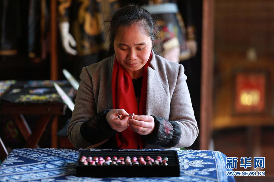 2月6日,在貴州省黎平縣一家手工銀飾店,侗族繡娘丁明煥組裝創(chuàng)意刺繡銀飾戒指。近年來,貴州省黔東南苗族侗族自治州黎平縣大力發(fā)展文化創(chuàng)意產(chǎn)業(yè),鼓勵和扶持當?shù)乩C娘、手工藝人把民族刺繡、銀飾等設計成為具有當?shù)匚幕厣纳唐罚瑤尤罕娭赂辉鍪。新華社發(fā)(楊代富 攝) -