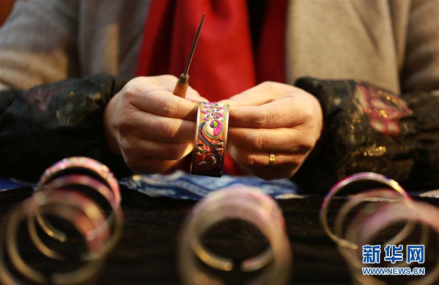 2月6日,在貴州省黎平縣一家手工銀飾店,侗族繡娘丁明煥組裝創(chuàng)意刺繡銀飾手鐲。近年來,貴州省黔東南苗族侗族自治州黎平縣大力發(fā)展文化創(chuàng)意產(chǎn)業(yè),鼓勵和扶持當?shù)乩C娘、手工藝人把民族刺繡、銀飾等設計成為具有當?shù)匚幕厣纳唐,帶動群眾致富增收。新華社發(fā)(楊代富 攝) -