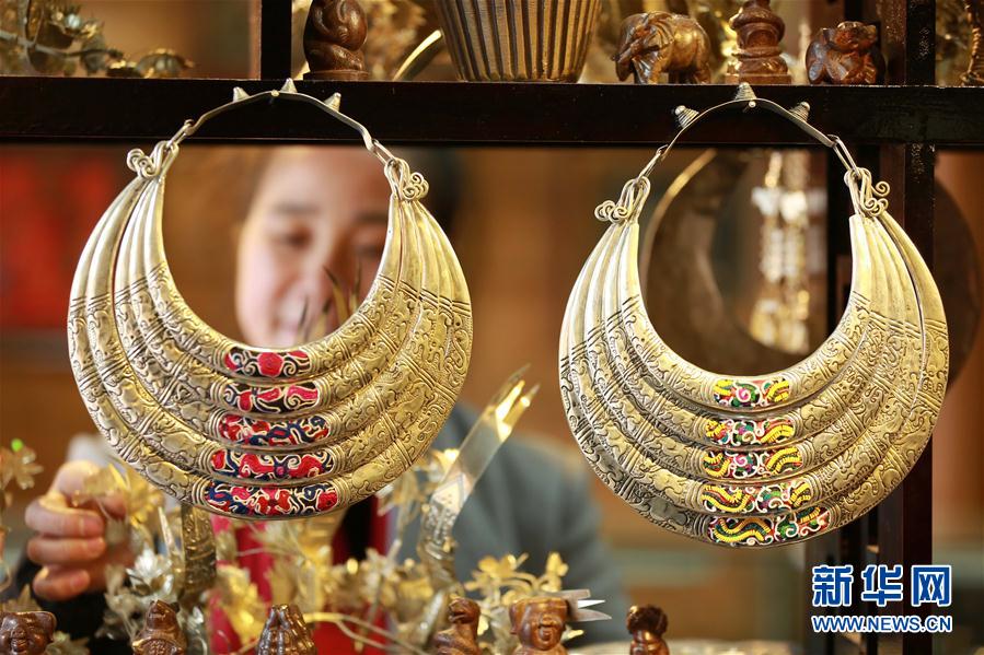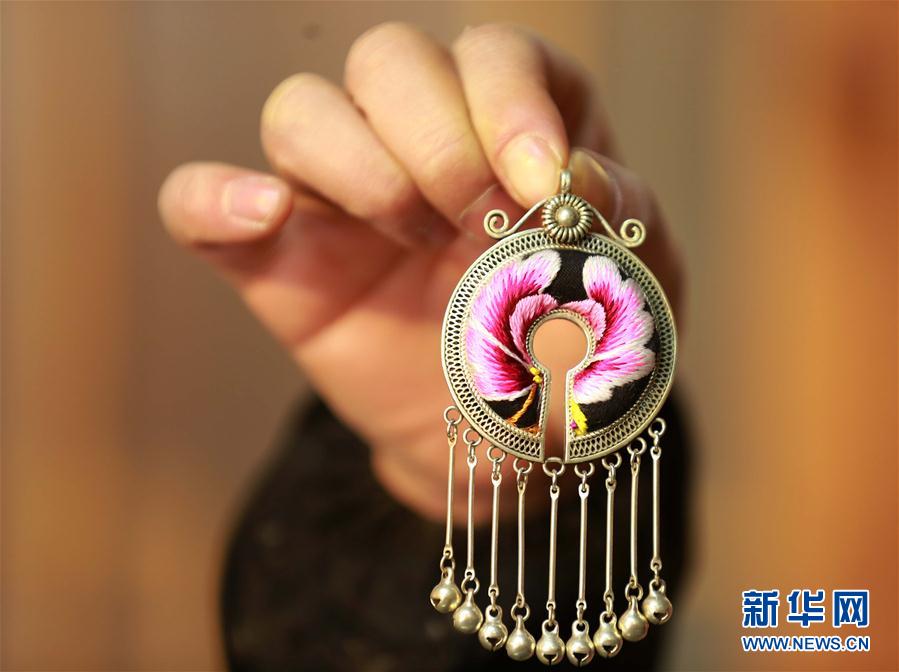 2月6日,在貴州省黎平縣一家手工銀飾店,侗族繡娘丁明煥展示創(chuàng)意刺繡銀飾耳環(huán)。近年來,貴州省黔東南苗族侗族自治州黎平縣大力發(fā)展文化創(chuàng)意產(chǎn)業(yè),鼓勵和扶持當?shù)乩C娘、手工藝人把民族刺繡、銀飾等設計成為具有當?shù)匚幕厣纳唐,帶動群眾致富增收。新華社發(fā)(楊代富 攝) -