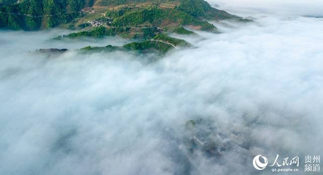 航拍貴州山村:霧繞仡鄉(xiāng)美如畫(高清組圖),4月17日,從空中俯瞰貴州省務(wù)川仡佬族苗族自治縣紅絲鄉(xiāng)先進(jìn)村,晨曦透過云霧,光輝灑滿村莊與青山,形成一幅夢(mèng)幻山村圖,宛若仙境。(田東)