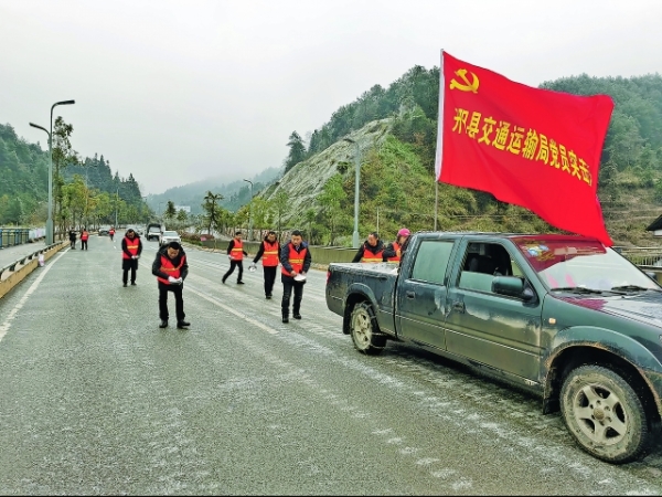圖為開(kāi)陽(yáng)縣交通局應(yīng)急突擊隊(duì)員在道路上撒鹽除冰。