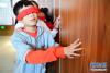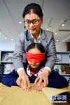 10月15日,在河北省廊坊市安次區(qū)圖書館視障閱讀區(qū),小學(xué)生們將雙眼蒙住體驗(yàn)在黑暗中行走。 新華社發(fā)(劉學(xué)民 攝)