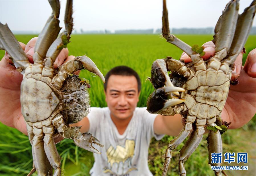 7月28日,唐山市曹妃甸區(qū)一農(nóng)場的農(nóng)民在有機(jī)稻田邊展示田間養(yǎng)殖的螃蟹。