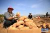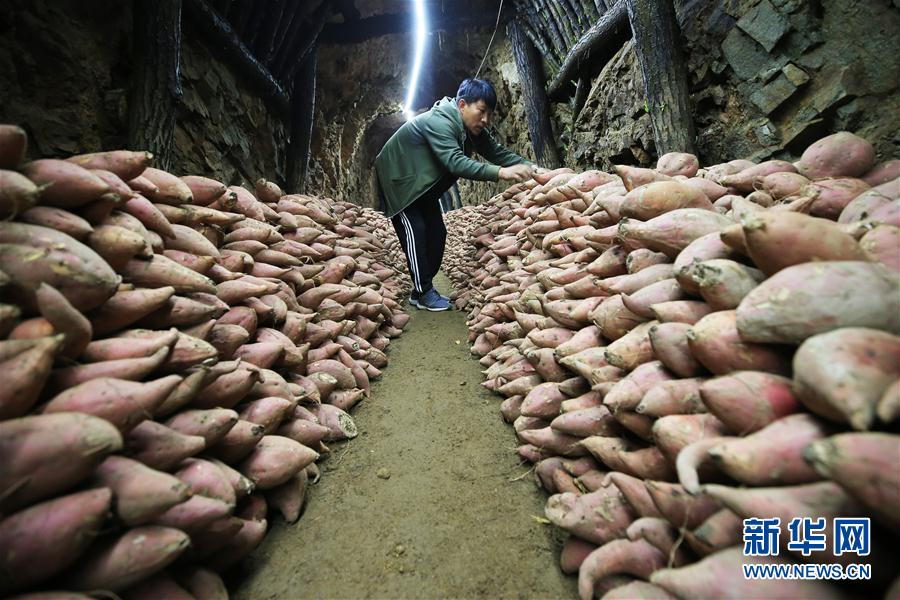 10月12日,工作人員在整理儲(chǔ)藏在山洞里的紅薯。新華社發(fā)(王愛軍 攝) -