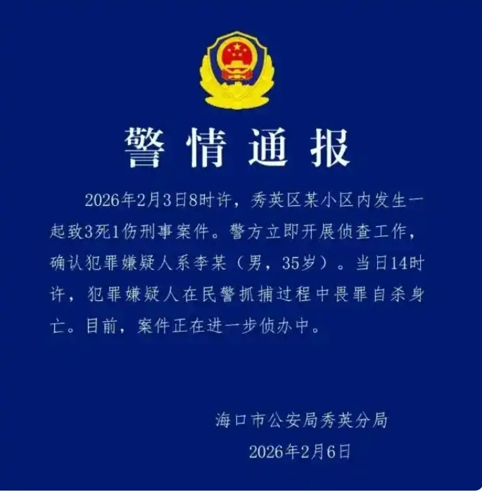 2026年2月3日8時許,秀英區(qū)某小區(qū)內(nèi)發(fā)生一起致3死1傷刑事案件。警方立即開展偵查工作,確認犯罪嫌疑人系李某(男,35歲)。當(dāng)日14時許,犯罪嫌疑人在民警抓捕過程中畏罪自殺身亡。目前,案件正在進一步偵辦中。