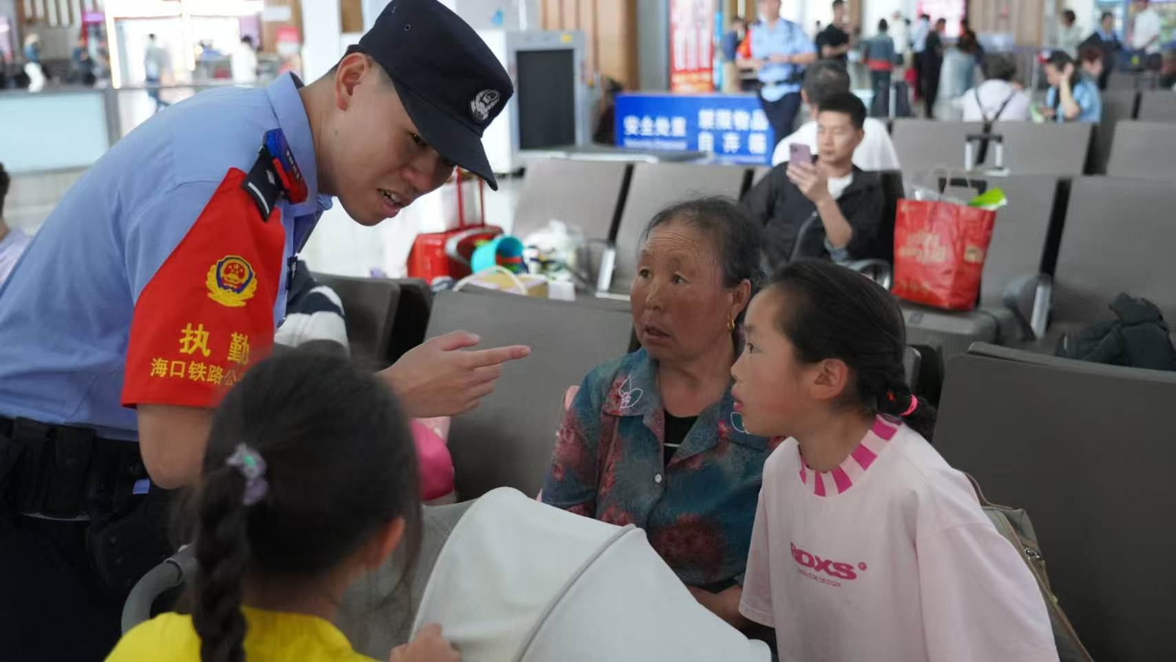 在三亞站售票廳,一名外籍旅客焦急地向執(zhí)勤民警問詢,民警立即微笑應(yīng)答,一邊用流利的英語細(xì)致指引,一邊手持手機(jī)演示購票流程,一句句清晰的講解,一次次貼心的幫助,讓外籍旅客感受到了溫暖!按哼\(yùn)期間人很多,但這里的警察一直堅(jiān)守崗位,守護(hù)我們的安全,在海南旅行非常安心,太感謝你們了!”一位俄羅斯旅客通過翻譯軟件向民警表達(dá)謝意,簡單的話語里,充滿了認(rèn)可。