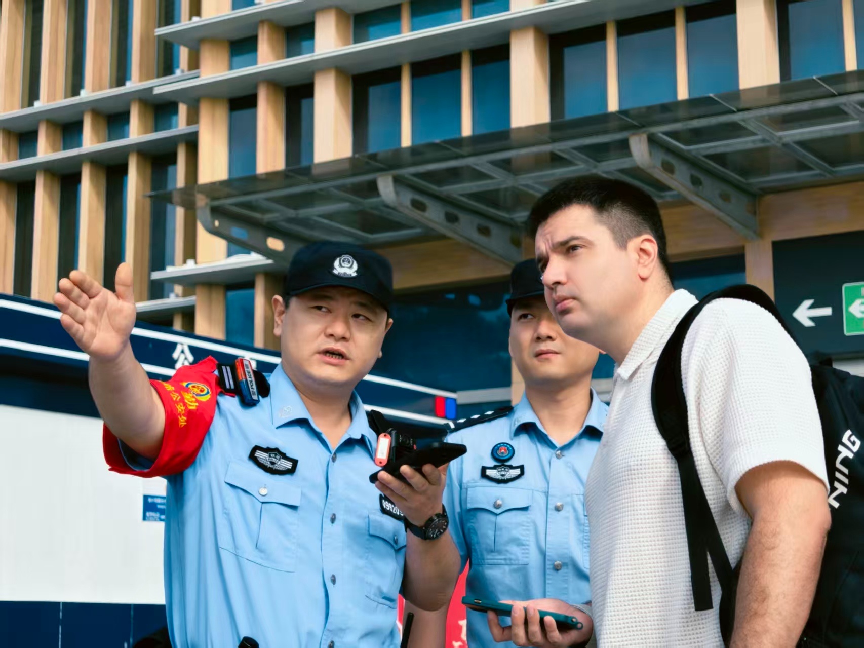 執(zhí)勤民警為外國旅客提供指引服務(wù)(央廣網(wǎng)發(fā) 汪楚雯 攝)