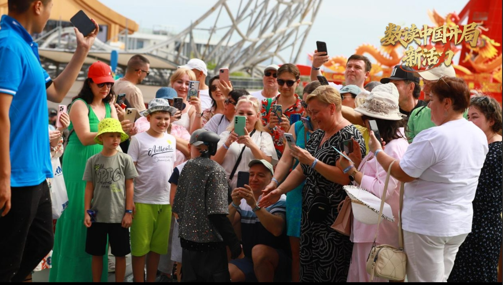 游客在景區(qū)與機(jī)器人互動(dòng)(央廣網(wǎng)記者 蔡文娟 攝)