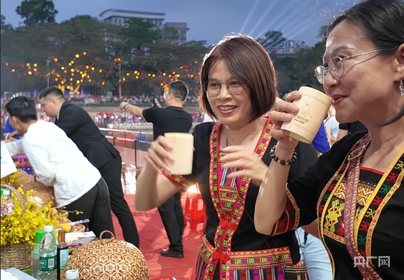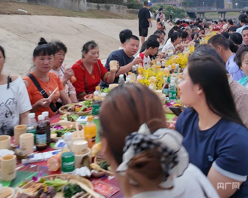 當(dāng)晚,兩岸燈火璀璨,長桌沿河岸整齊鋪開,形成一道獨具特色的民俗風(fēng)景線。身著絢麗黎苗服飾的阿哥阿妹,端上三色飯、山蘭酒等特色美食,將黎苗同胞的熱情與心意盛滿宴席,這一待客迎賓的最高禮遇,讓現(xiàn)場賓客倍感溫暖。