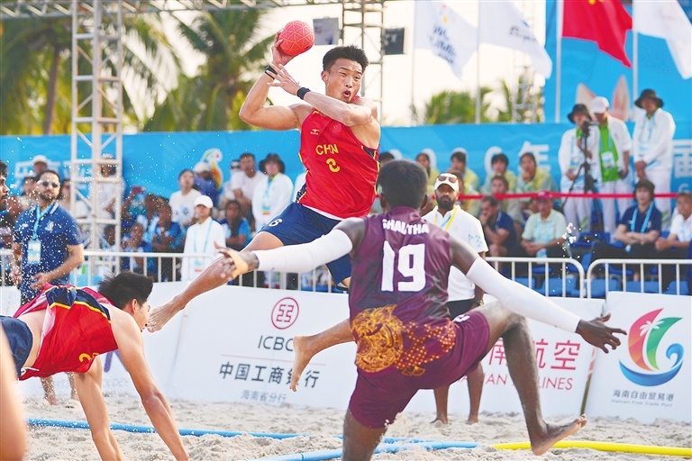 4月21日,第六屆亞洲沙灘運動會在海南三亞開賽。當天下午,中國男子沙灘手球隊迎戰(zhàn)斯里蘭卡男子沙灘手球隊,最終以2∶0戰(zhàn)勝對手。(記者 王程龍)