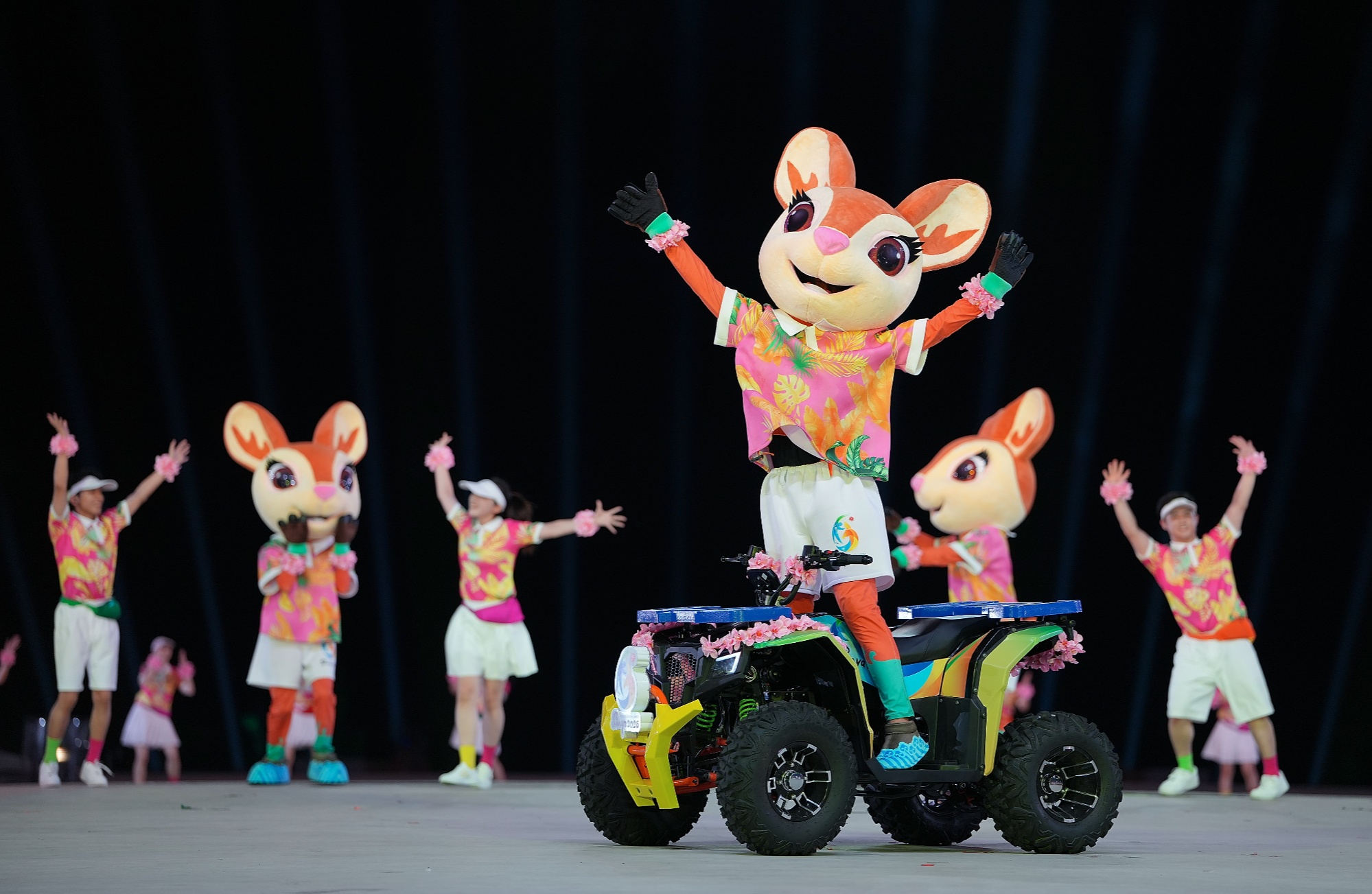 夜幕下的三亞亞沙公園華燈璀璨、流光溢彩。當晚20時,開幕式正式開始。伴隨著動感旋律,賽事吉祥物“亞亞”騎著沙灘摩托車引領(lǐng)著亞奧理事會45個成員代表團依次入場,共赴天海之約。