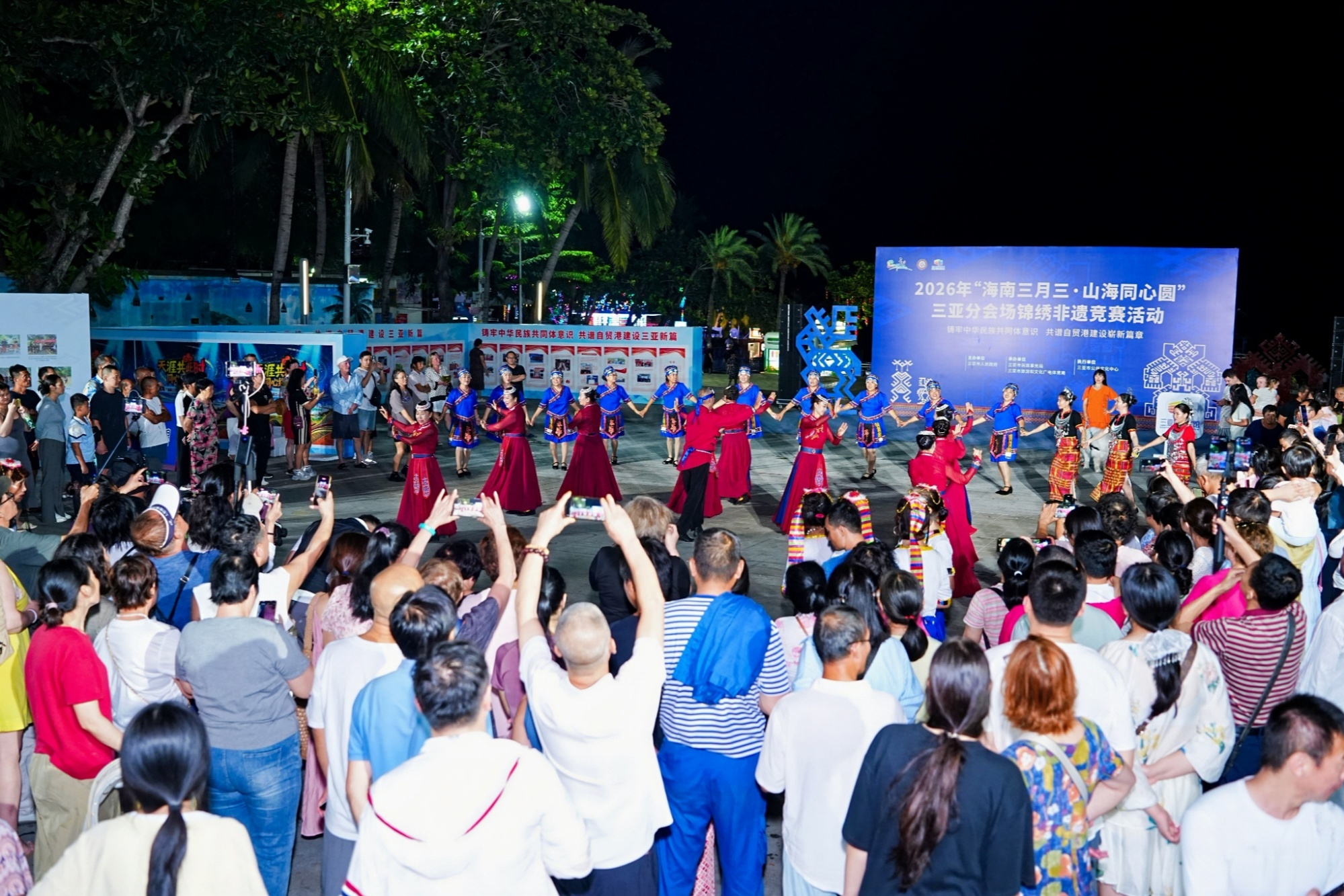 央廣網(wǎng)三亞4月17日消息(記者 蔡文娟)4月17日,2026年“海南三月三·山海同心圓”三亞分會(huì)場(chǎng)——錦繡非遺技藝競(jìng)賽活動(dòng)在三亞大東海廣場(chǎng)熱鬧開啟;顒(dòng)以“鑄牢中華民族共同體意識(shí) 共譜自貿(mào)港建設(shè)嶄新篇章”為主題,集黎錦苗繡競(jìng)技、沉浸式游園、民族聯(lián)歡、亞沙互動(dòng)、文創(chuàng)展銷等8大特色亮點(diǎn)于一體。黎錦的斑斕色彩、苗繡的精細(xì)紋樣與第六屆亞洲沙灘運(yùn)動(dòng)會(huì)(以下簡(jiǎn)稱“三亞亞沙會(huì)”)的青春活力交相輝映,數(shù)千名市民、游客和外國(guó)友人紛至沓來(lái),共慶佳節(jié)。