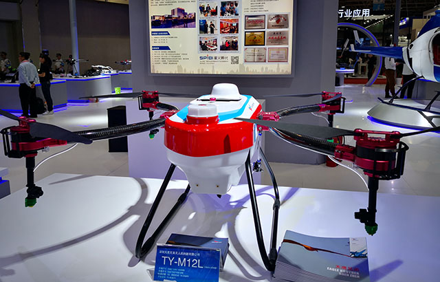 天鷹兄弟集團應組委會邀請,攜最新自主研發(fā)的多旋翼植保無人機TY-M12L精彩亮相2019年中國·廊坊國際經(jīng)濟貿易洽談會,受到政府領導及與會觀眾的高度關注,F(xiàn)場負責人毛海興介紹這款被稱為“長腦的打藥神器”藥箱容量為12升,續(xù)航時間是18-25分鐘,作業(yè)效率為70-90畝每小時;獨創(chuàng)C型機臂創(chuàng)新設計,一步式折疊收納,運輸更便捷;全機身模塊化設計,便于拆裝與維修,維護成本低;機身采用工業(yè)三防設計,在惡劣作業(yè)環(huán)境下也能正常運作;同時配備了智能化噴灑系統(tǒng),可針對不同作物及環(huán)境進行精準噴灑;支持全自主飛行控制及夜航作業(yè)飛行。