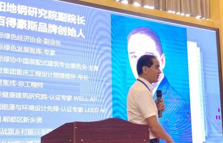 圖為:四川百得豪斯綠色建筑有限公司創(chuàng)始人-李群鴿先生分享“輕鋼發(fā)展的歷史進(jìn)程和國(guó)內(nèi)外發(fā)展的差距”(周珊·攝)