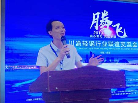 圖為:重慶快聯(lián)鋼結(jié)構(gòu)有限公司總經(jīng)理-刁家勇先生 分享“我的輕鋼之路”(周珊·攝)
