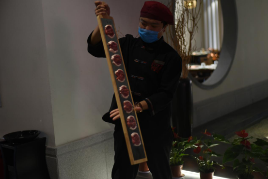 3、新鮮現(xiàn)切,所有鮮肉保證冷鏈運輸,最大極限保證肉質(zhì)的新鮮。明檔現(xiàn)切,新鮮看得見。置于盤上,任性翻轉(zhuǎn)不脫落。