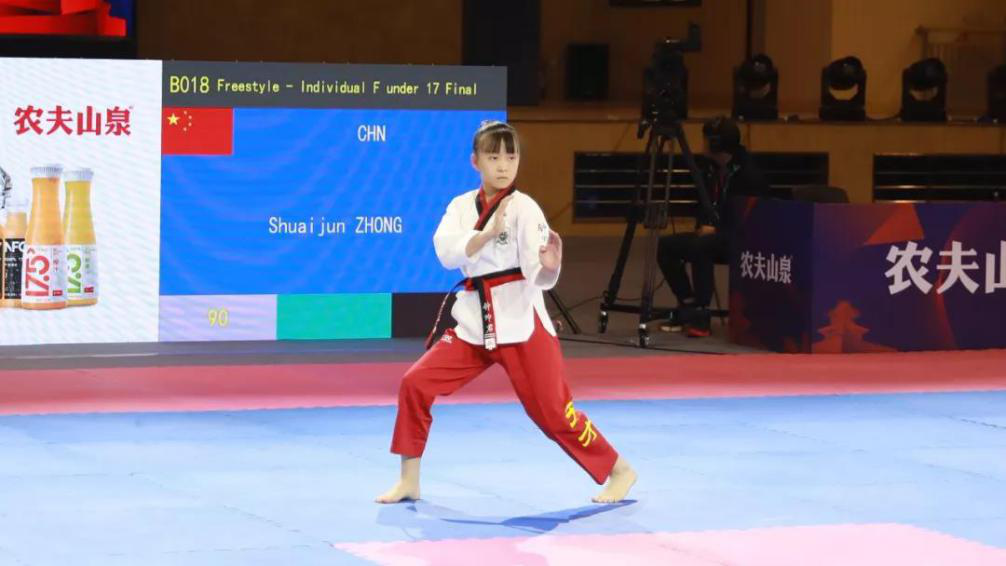 鐘帥君同學(xué)世界跆拳道公開賽中獲自由品勢項目比賽第一名
