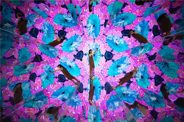非遺萬花筒,巨大的萬花筒五光十色,不僅隨著音樂變換著不同圖案里面更藏著婺源各種非遺文化元素。