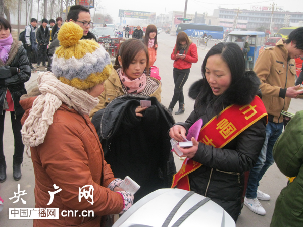 巾幗志愿者們向農(nóng)民工發(fā)放法律安全知識手冊,宣傳“預(yù)防拐賣知識”。