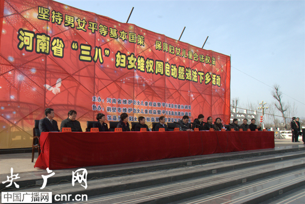 央廣網(wǎng)河南分網(wǎng)消息 3月1日上午,歷史文化名城--鶴壁市淇縣朝歌文化遺址廣場(chǎng)鑼鼓喧天、彩旗招展,河南省維護(hù)婦女兒童權(quán)益暨平安家庭創(chuàng)建協(xié)調(diào)組在這里隆重舉行河南省“三八”婦女維權(quán)周啟動(dòng)暨送法下鄉(xiāng)活動(dòng)啟動(dòng)儀式。