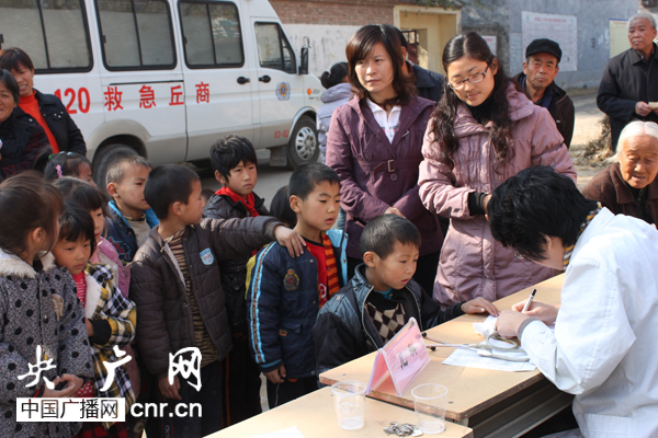 河南省商丘市婦聯(lián)駐村工作隊請來醫(yī)院專家為村里的留守兒童進行健康檢查
