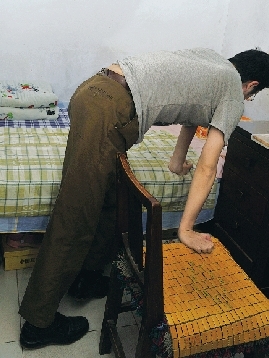 這樣保持了兩分鐘,他開(kāi)始用手撐住腳部慢慢向上挪動(dòng),到膝蓋位置時(shí)他喘了口氣,右手扶住膝蓋,左手扶住椅子,身體仍90度彎曲。就這樣,他靠著椅子做支點(diǎn),上半身帶動(dòng)下半身,讓僵硬的兩條腿向床邊靠近。