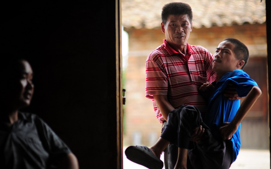 9月10日,在江西贛州江背村家中,父親把“漸凍人”劉良玉抱進(jìn)門。