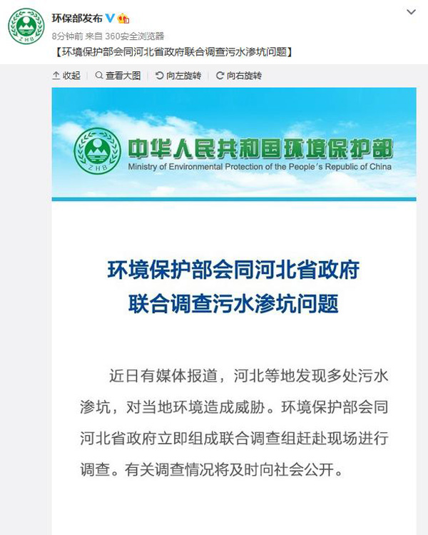 據(jù)環(huán)境保護部宣傳教育司官方微博消息,近日有媒體報道,河北等地發(fā)現(xiàn)多處污水滲坑,對當(dāng)?shù)丨h(huán)境造成威脅。環(huán)保部會同河北省政府已成立聯(lián)合調(diào)查組趕赴現(xiàn)場進(jìn)行調(diào)查。據(jù)介紹,有關(guān)調(diào)查情況將及時向社會公開。